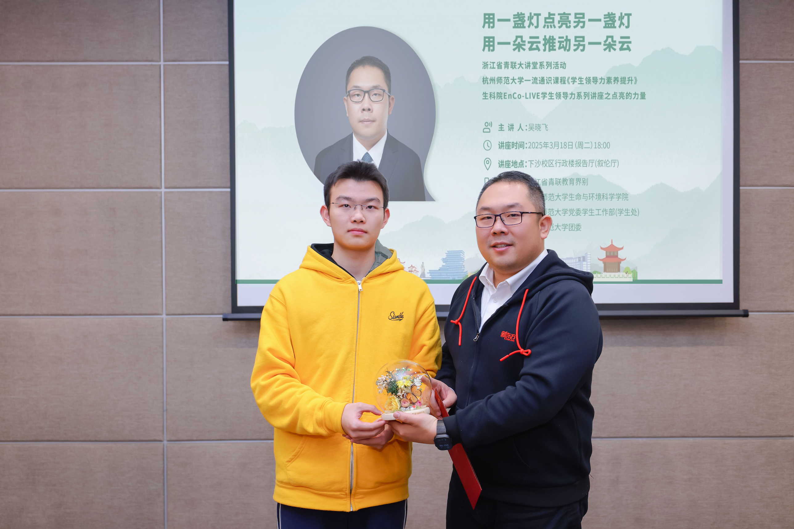 2025年3月18日晚,浙江省青联大讲堂走进杭师大,省青联常委、新东方集团副总裁、浙江新东方党委书记吴晓飞做了题为“点亮的力量——用一盏灯点亮另一盏灯,用一朵云推动另一朵云”的讲座。讲座与杭师大一流通识课程《学生领导力素养提升》、做爱自拍 EnCo-LIVE学生领导力系列讲座相结合,由浙江省青联教育界别、杭师大做爱自拍 、学工部(学生处)与校团委联合组织,省青联委员、中核运维技术有限公司高级工程师徐中,浙江新东方人力资源总监助理张明亮、创新业务部行政党建经理陈佳出席,省青联委员、做爱自拍 党委副书记王倩主持,近200名师生参加。