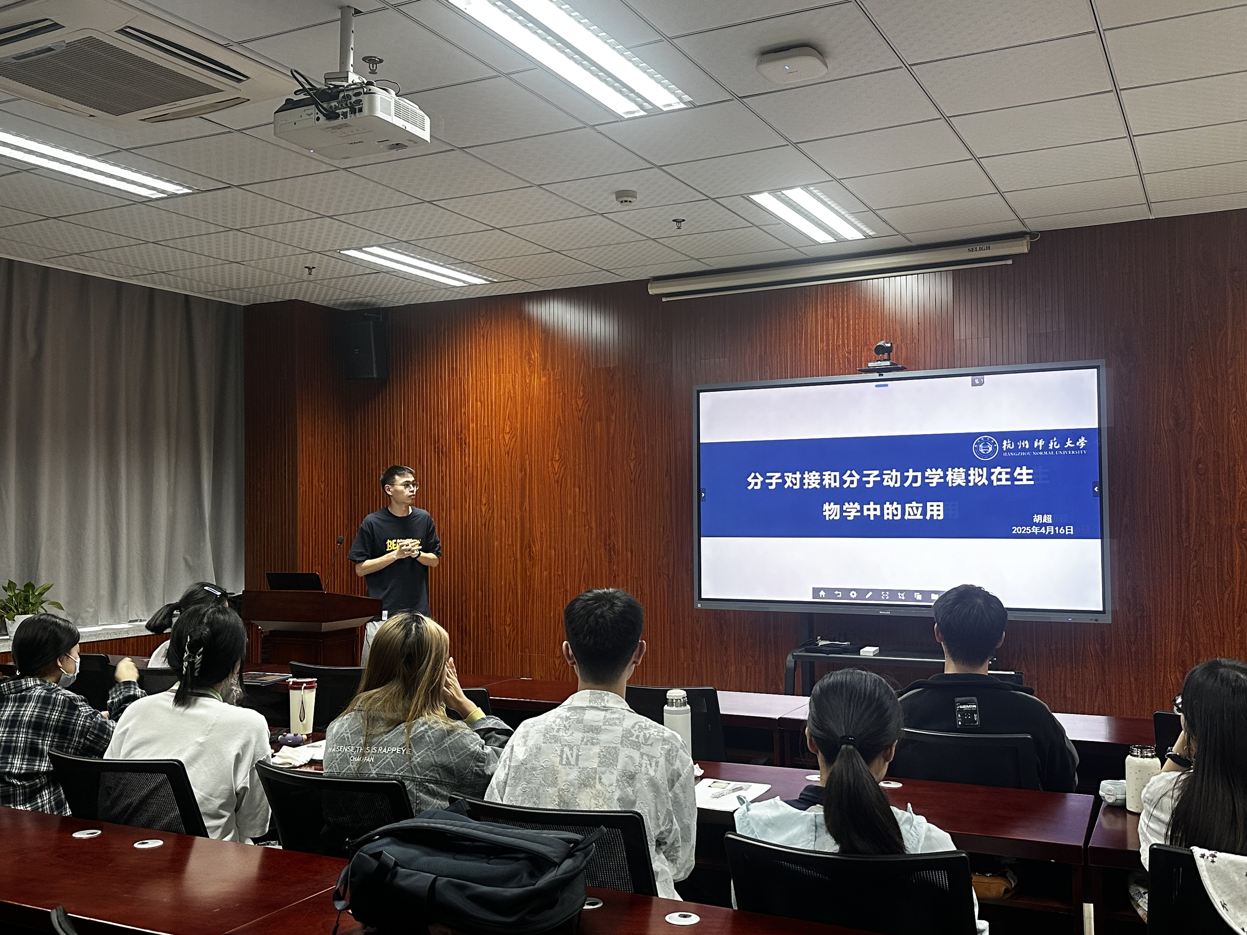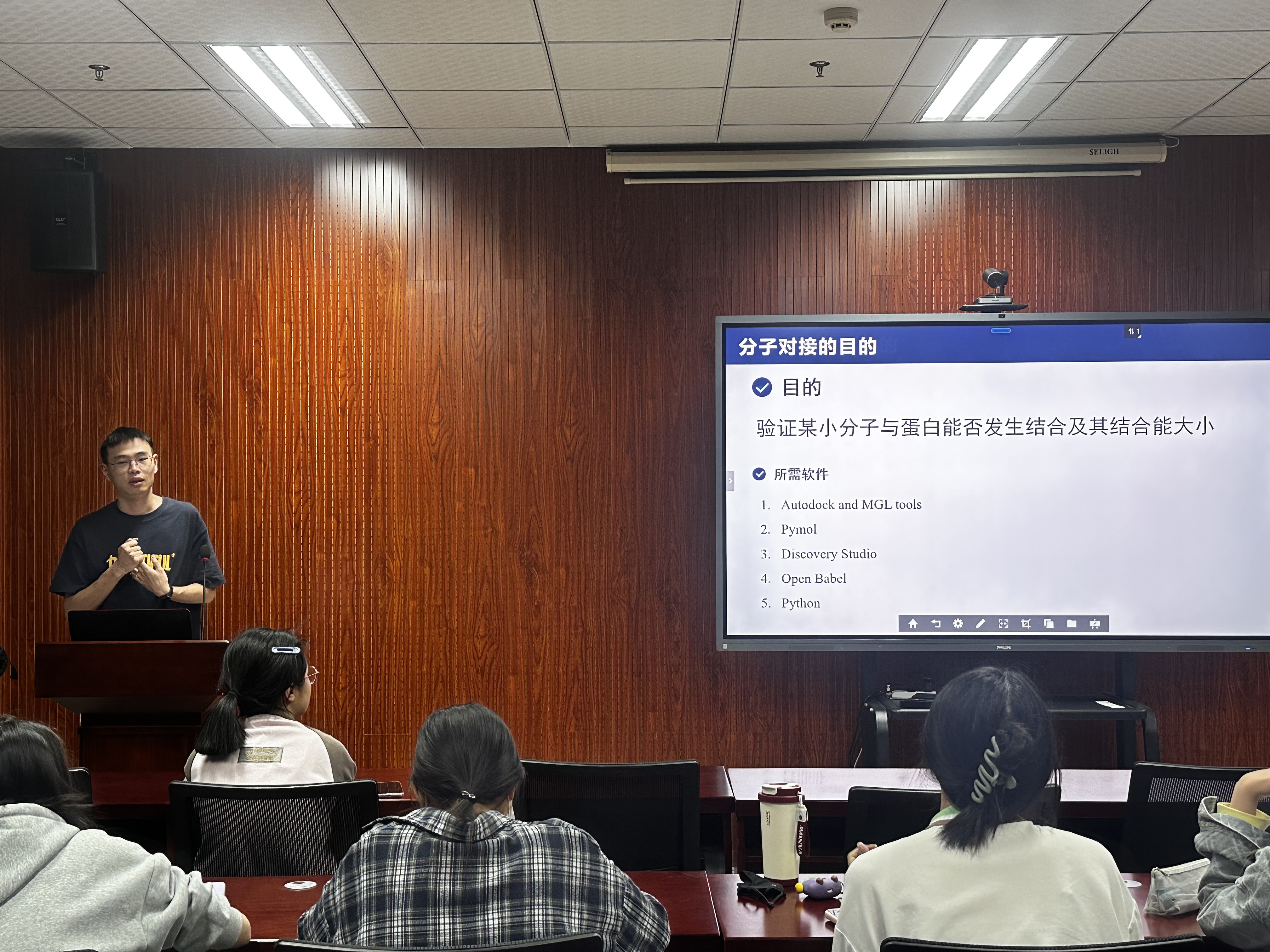 4月16日下午,做爱自拍 “生科创新人才菁英讲堂”第二期在慎园15-313会议室顺利举办。2024级生物学专业博士研究生胡超作题为“分子对接及分子动力学模拟在生物学中的应用”的报告,分享了分子对接与动力学模拟的核心技术、操作流程及科研应用,为拔尖班同学带来科技前沿技术。