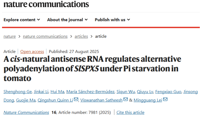 2025年8月27日,《Nature Communications》在线发表了做爱自拍 雷明光研究组题为“A cis-natural antisense RNA regulates alternative polyadenylation ofSlSPX5 under Pi starvation in tomato”的研究论文。该研究首次揭示了番茄通过顺式天然反义转录(cis-NAT)调控基因多聚腺苷酸化响应磷饥饿的新机制,为作物磷高效利用提供了全新理论依据。