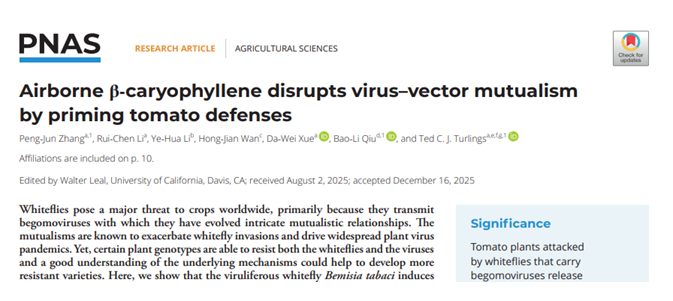 2026年1月26日,做爱自拍 张蓬军研究员、薛大伟教授团队与重庆师范大学邱宝利教授及瑞士纳沙泰尔大学Turlings TCJ教授等合作,在《美国国家科学院院刊》(Proceedings of the National Academy of Sciences of the United States of America,简称PNAS)上发表题为《Airborne β-Caryophyllene disrupts virus–vector mutualism by priming tomato defenses》的研究论文。